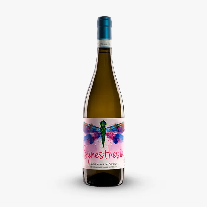La Falanghina del Sannio DOC “Synesthesia” di Vigna 360º è un vino che unisce arte, percezione e natura. Il suo nome deriva dal concetto di sinestesia, la capacità di percepire insieme più sensi — come ascoltare un colore o vedere un profumo. L’etichetta, dominata dai colori di una libellula in volo, simboleggia la trasformazione, la libertà e la ricerca della propria identità.